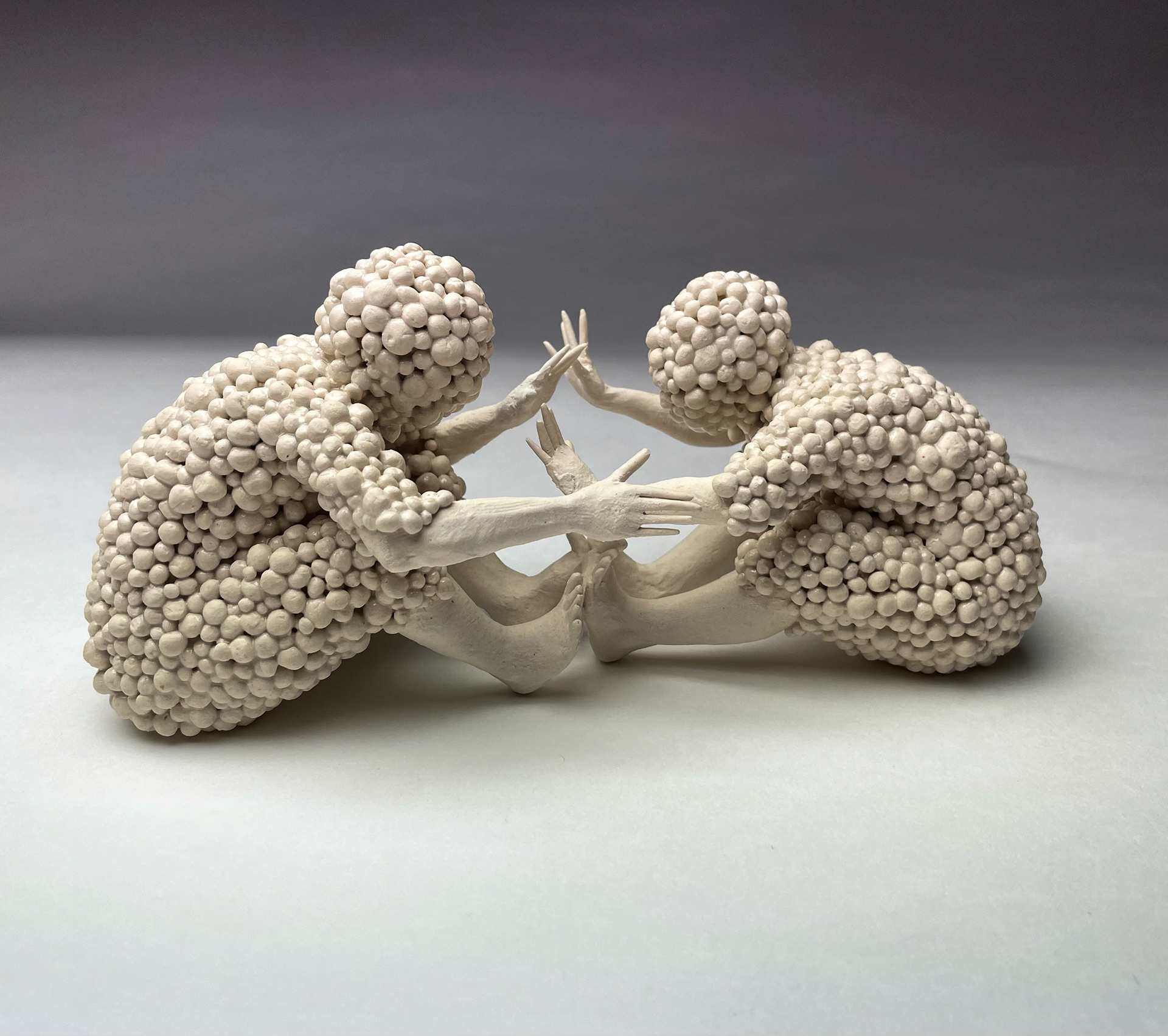 A true embrace is when our bodies meld into one another, often creating an effervescent, bubbly sensation that makes us feel truly together. These two porcelain figures reach out; their extremities acting like antennae sensing for the other in desperation to conjoin again.